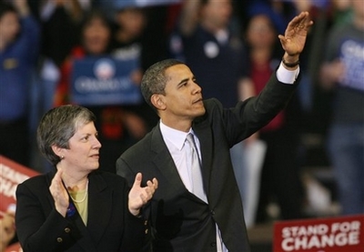 In this file photo from Wednesday, Jan. 30, 2008, US Democratic presidential hopeful Sen. Barack Obama, right, stands with Democratic Arizona Gov. Janet Napolitano as he holds a 'Stand for Change' rally at Veterans Memorial Coliseum in Phoenix. Democratic rising stars, Arizona Gov. Napolitano and Kansas Gov. Kathleen Sebelius, have been mentioned as two potential running mates who could help Barack Obama woo female voters. [Agencies]