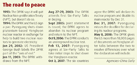 "The US will respond to the DPRK's actions by lifting the provisions of the Trading with the Enemy Act, as well, as announcing our intent to rescind the DPRK's designation as a State Sponsor of Terror in 45 days. During this period, the US will carefully assess the DPRK's actions particularly with regard to verification," White House press secretary Dana Perino said. The DPRK is likely to demolish the nuclear cooling tower in Yongbyon this afternoon. The demolition will be broadcast live, for which TV crews from China, Japan, Russia, the US and the ROK reached Pyongyang yesterday. The DPRK missed the deadline to submit the papers at the end of last year, leading to months of haggling with the US over what they should include. There are still some uncertainties in the denuclearization process, Chinese analysts said, and building of trust between Pyongyang and Washington is crucial. "The DPRK has misgivings about engaging with the outside world, said Jin Canrong, senior professor of international relations with Renmin University of China. "There is Japan's concern over the abduction and the Bush administration faces criticism at home for being 'too lenient' with Pyongyang so the process is still complicated," Jin said.