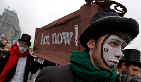 Activists carrying a casket demand more action to battle climate change during the 19th conference of the UN Framework Convention on Climate Change in Warsaw on Saturday. [Photo/Agencies] |