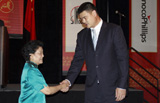 Chinese Vice Premier Liu Yandong speaks to the Tsinghua Youth team on June 21 prior to their friendship match with Houston local high school team at the Houston Rockets Toyota Center.