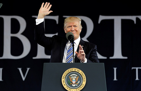 A combination of file photos showing Russian Foreign Minister Sergei Lavrov attending a news conference in Moscow, Russia, November 18, 2015, and US President Donald Trump posing for a photo in New York City, US, May 17, 2016. [Photo/Agencies] |