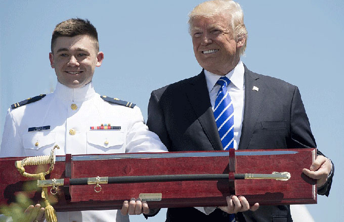 Trump and King Salman seemed at ease with each other, chatting through an interpreter. Walking with a cane, the king greeted Trump on the tarmac. A military brass band played, cannons boomed and seven Saudi jets flew over in V-formation, trailing red, white and blue smoke.